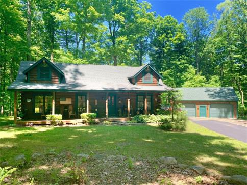 Beautiful and stylish log home situated on double treed lots, features include 2 bedrooms and a full main level bath with convenient first floor laundry, stunning vaulted ceiling living room with wood beams and hardwood floors, adjoining dining area with lots of natural light, cottage style kitchen with major appliances and unique bench seating, first floor bedroom plus a second floor loft bedroom, relaxing covered front and rear porches, detached and oversized 2 car garage, paved driveway, natural gas heat and central air, perfect for full or part time lake living, impressive home for $190,000.