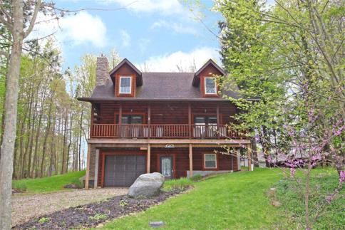 Exceptional log cabin with a view of Apple Valley Lake, wonderful location, this quality Amish constructed log home features 3 bedrooms and 2.5 baths, open great room floor plan with living room, dining area and hickory cabinet filled kitchen, there is a wood burning fireplace, open staircase leads to the second floor with open loft space, finished walkout lower level with family room and half bath, relaxing covered front porch with view of lake, fantastic rear patio space with fire pit, attached 1.5 car garage, natural gas forced air heating and central air, truly stunning home for only $175,000.
